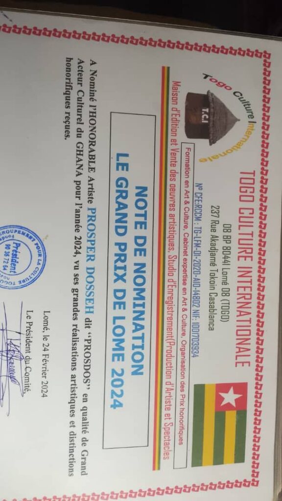 The nomination document, dated February 24, 2024, highlights Prosdos’s “great artistic achievements and honorary distinctions received.” This recognition from a respected cultural organization in Togo solidifies his growing influence in the West African music and arts scene.